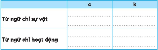 Tìm thêm từ ngữ chỉ sự vật, hoạt động có tiếng bắt đầu bằng c hoặc k.