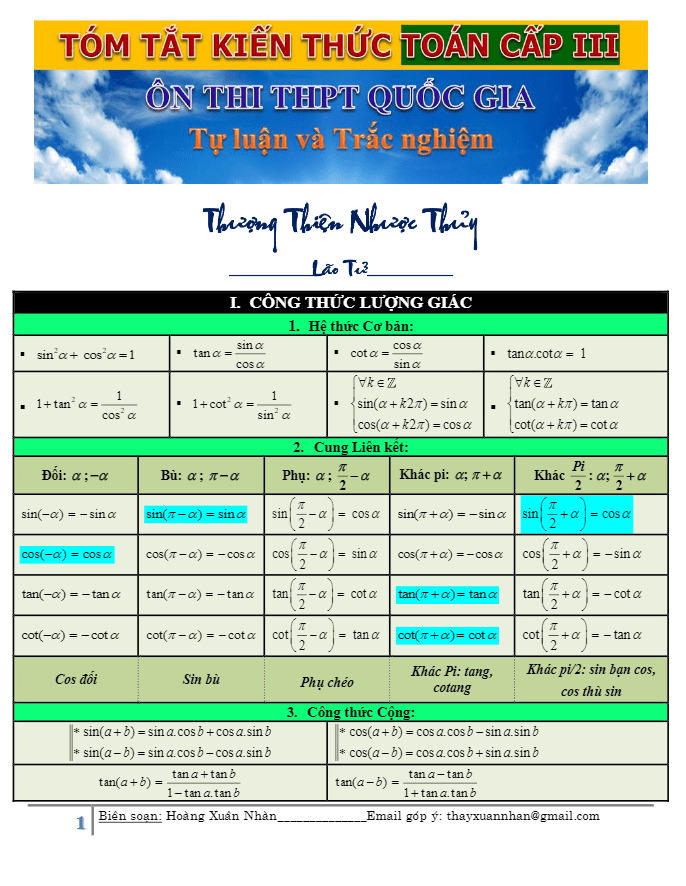 Tóm tắt kiến thức Toán ôn thi THPT Quốc gia của Hoàng Xuân Nhàn là một tài liệu dày 41 trang, được biên soạn bởi thầy giáo nổi tiếng trong lĩnh vực Toán học. Tài liệu này tập trung vào việc tổng hợp kiến thức môn Toán cho các học sinh cấp độ 10, 11 và 12, nhằm giúp họ ôn thi THPT Quốc gia môn Toán một cách hiệu quả.Nội dung của tài liệu được chia thành 14 chủ đề chính, bao gồm các kiến thức cơ bản và nâng cao như công thức lượng giác, phương trình lượng giác, tổ hợp – xác suất, khai triển nhị thức Newton, cấp số cộng – cấp số nhân, giới hạn dãy số – hàm số, đạo hàm, khảo sát hàm số và bài toán liên quan, lũy thừa – mũ và logarit, nguyên hàm – tích phân, số phức và các yếu tố liên quan, khối đa diện và thể tích, hình học giải tích trong không gian, gắn tọa độ vào hình học không gian.Với cách trình bày chi tiết, cụ thể và dễ hiểu, tài liệu giúp học sinh nắm vững kiến thức, rèn luyện kỹ năng giải bài tập một cách logic và tự tin. Đồng thời, việc phân tích, giải thích sắc thái và biểu cảm trong từng chủ đề giúp học sinh hiểu sâu hơn về các vấn đề Toán học và áp dụng chúng vào thực tế. Đây chắc chắn là một nguồn tư liệu hữu ích cho các học sinh chuẩn bị cho kỳ thi quan trọng.