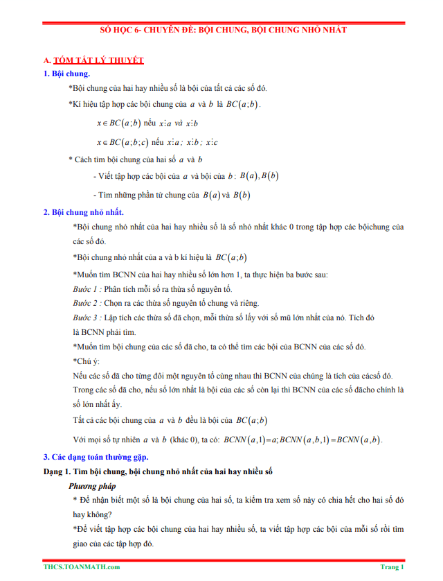 Tóm tắt lý thuyết và bài tập trắc nghiệm chuyên đề bội chung, bội chung nhỏ nhất