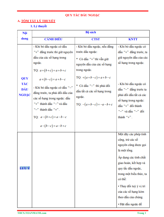 Tóm tắt lý thuyết và bài tập trắc nghiệm chuyên đề quy tắc dấu ngoặc