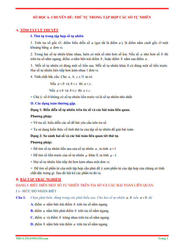 Sytu xin gửi đến quý thầy cô và các em học sinh lớp 6 tài liệu tóm tắt lý thuyết và bài tập trắc nghiệm chuyên đề thứ tự trong tập hợp các số tự nhiên. Tài liệu bao gồm các bài toán được chọn lọc và phân loại theo các dạng toán, từ cơ bản đến nâng cao, với đáp án và hướng dẫn giải chi tiết.