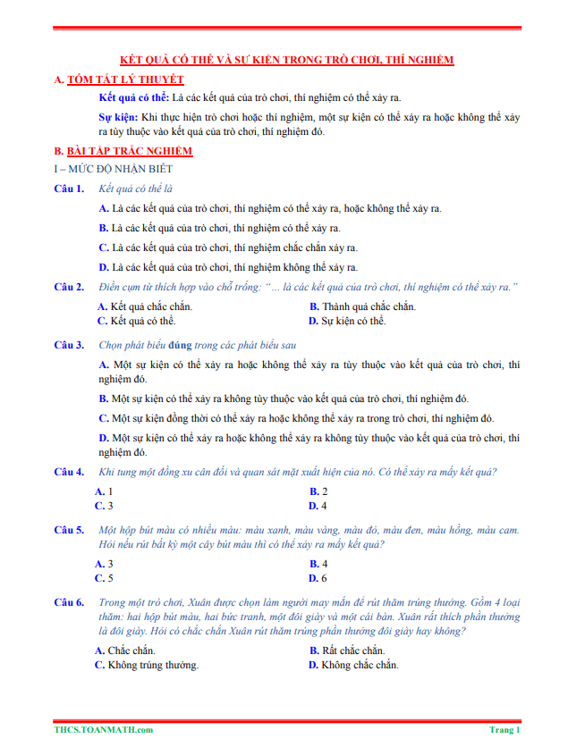 Sytu giới thiệu tới quý thầy cô và các em học sinh lớp 6 tài liệu tóm tắt lý thuyết và bài tập trắc nghiệm chuyên đề về kết quả có thể và sự kiện trong trò chơi và thí nghiệm. Trước hết, chúng ta cần hiểu rõ rằng kết quả có thể là những kết quả mà chúng ta có thể thu được từ việc thực hiện trò chơi hoặc thí nghiệm. Trong khi đó, sự kiện là những tình huống có thể xảy ra hoặc không xảy ra tùy thuộc vào kết quả của trò chơi hoặc thí nghiệm đó.Nội dung tài liệu này đã được chia thành các bài tập trắc nghiệm được lựa chọn và phân loại theo từng dạng toán, từ cơ bản đến nâng cao. Mỗi bài toán đều có đáp án và hướng dẫn giải chi tiết, giúp các em học sinh tham khảo khi học Toán lớp 6. Tài liệu này đã được biên soạn đầy đủ và cụ thể từ lý thuyết đến bài tập trắc nghiệm, giúp các em hiểu rõ hơn về chủ đề này. Hy vọng rằng tài liệu này sẽ giúp ích cho quý thầy cô giáo và các em học sinh trong việc học tập và rèn luyện kỹ năng Toán của mình. Chúc quý thầy cô và các em có những giờ học vui vẻ và hiệu quả!