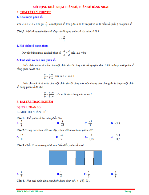 Sytu xin gửi đến quý thầy cô và các em học sinh lớp 6 tài liệu học về phân số và phân số bằng nhau. Trước hết, chúng ta cần hiểu rõ khái niệm phân số, trong đó a/b được gọi là một phân số với a là tử số và b là mẫu số. Mọi số nguyên cũng có thể được viết dưới dạng phân số với mẫu số là 1.