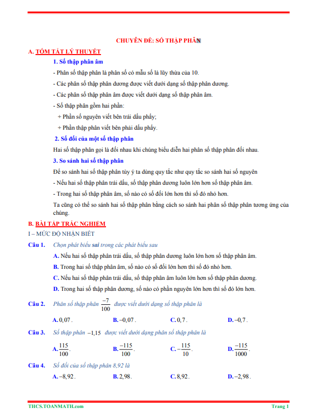 Sytu xin gửi đến quý thầy cô và các em học sinh lớp 6 tài liệu tóm tắt lý thuyết và bài tập trắc nghiệm về chuyên đề số thập phân. Trọn bộ tài liệu đã được chọn lọc và phân loại theo các dạng toán, từ cơ bản đến nâng cao, giúp các em nắm vững kiến thức một cách dễ dàng.A. TÓM TẮT LÝ THUYẾT1. Số thập phân:- Phân số thập phân là phân số có mẫu số là lũy thừa của 10.- Số thập phân dương được viết dưới dạng số thập phân dương.- Số thập phân âm được viết dưới dạng số thập phân âm.- Số thập phân gồm hai phần: phần số nguyên viết bên trái dấu phẩy và phần thập phân viết bên phải dấu phẩy.2. Số đối của một số thập phân:Hai số thập phân gọi là đối nhau khi chúng biểu diễn hai phân số thập phân đối nhau.3. So sánh hai số thập phân:Để so sánh hai số thập phân, ta có thể sử dụng quy tắc so sánh hai số nguyên. Ngoài ra, ta cũng có thể so sánh bằng cách so sánh hai phân số thập phân tương ứng.B. BÀI TẬP TRẮC NGHIỆM- File WORD (dành cho quý thầy, cô) chứa các bài tập trắc nghiệm giúp các em ôn tập và kiểm tra kiến thức của mình.Tài liệu này hi vọng sẽ giúp các em học sinh lớp 6 có thêm nguồn tư liệu hữu ích để tự học và ôn tập môn Toán một cách hiệu quả. Hãy cùng Sytu chinh phục thử thách và đạt được kết quả cao trong học tập!