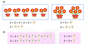5 + 5 = 10 tương ứng với phép nhân là 5 × 2 = 10 ;