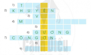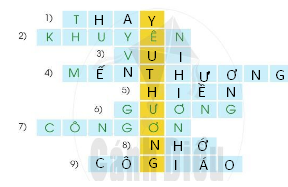 Câu 1. Dựa vào gợi ý tìm chữ cái phù hợp với mỗi ô trống để hoàn thành các từ theo từng dòng. Đọc từ mới xuất hiện ở cột tô màu vàng.