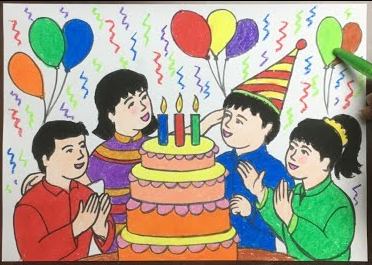 Không khí của buổi sinh nhật được thể hiện trong bài vẽ