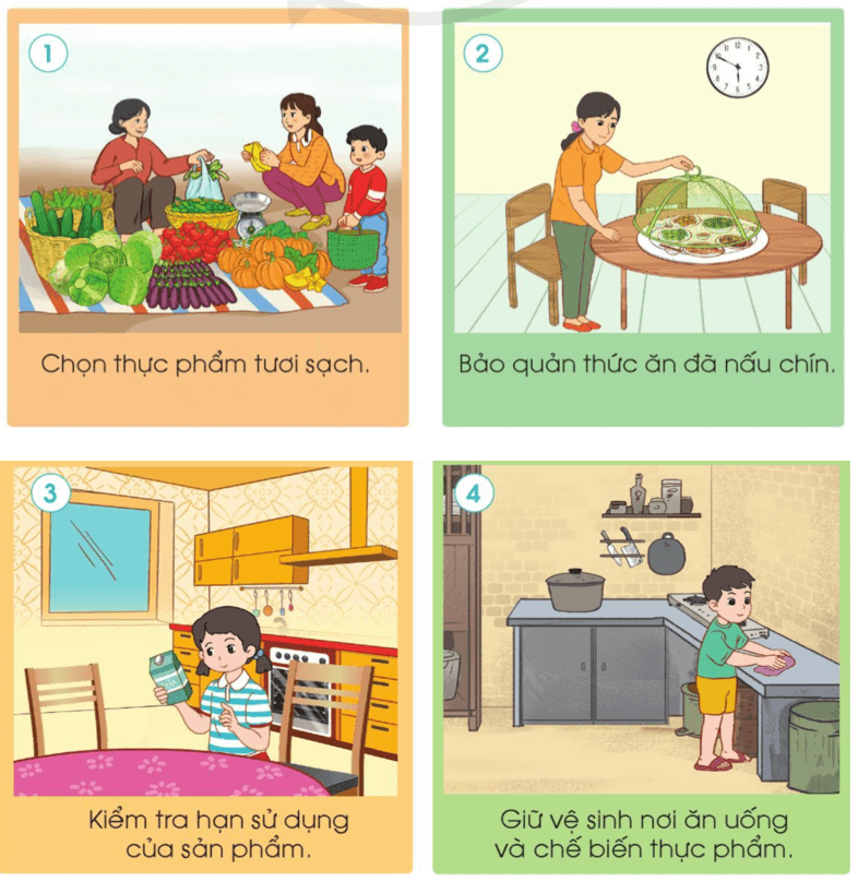 – Quan sát tranh và thảo luận về những việc làm đảm bảo vệ sinh an toàn thực phẩm.