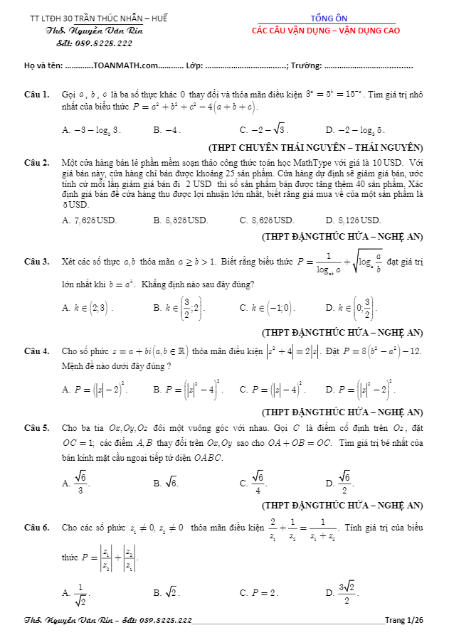 Tuyển chọn 152 bài toán vận dụng cao trong các đề thi thử Nguyễn Văn Rin