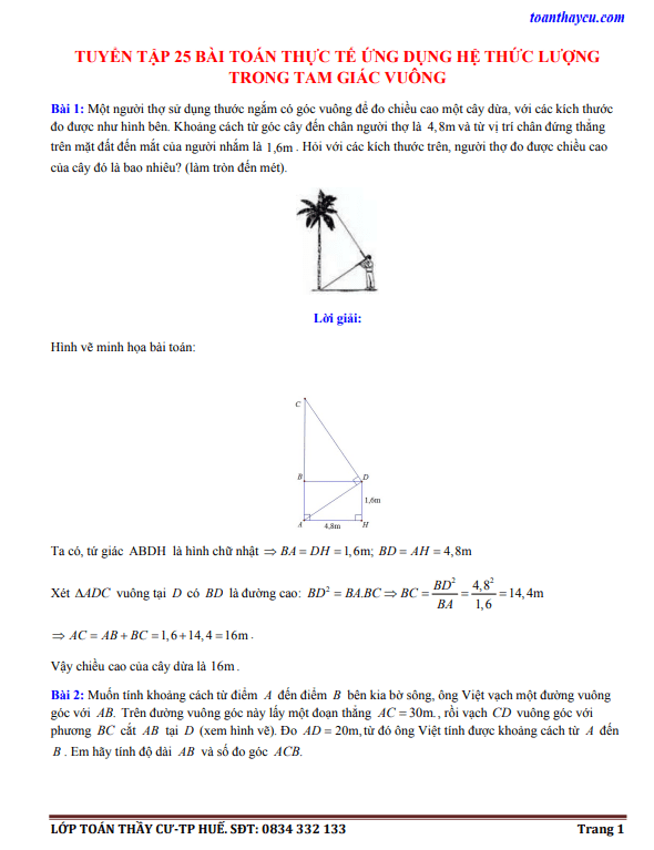 Tuyển tập 25 bài toán thực tế ứng dụng hệ thức lượng trong tam giác vuông