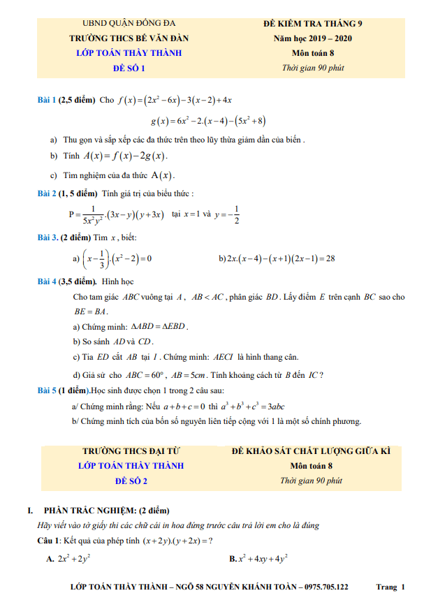 Tuyển tập 40 đề kiểm tra KSCL giữa học kì 1 (HK1) lớp 8 môn Toán