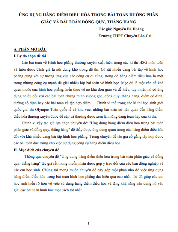 Phần mở đầu của tài liệu giải thích về lý do chọn đề tài là vì các bài toán về Hình học phẳng luôn là điểm khó trong các kỳ thi HSG môn Toán. Hàng điểm điều hòa là một công cụ quan trọng để giải quyết nhiều bài toán trong hình học phẳng. Tác giả mong muốn tài liệu này giúp học sinh hiểu rõ hơn về cách sử dụng hàng điểm điều hòa và áp dụng nó vào giải các bài toán hình học.