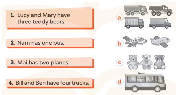 3. Lucy and Nam have one plane and four cars. (Lucy và Nam có 1 chiếc máy bay và 4 chiếc xe ô tô.)