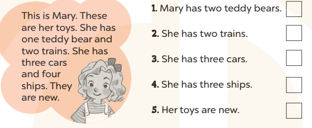 Đây là Mary. Đây là những đồ chơi của cô ấy. Cô ấy có một con gấu bông và hai chiếc tàu hỏa. Cô ấy có 3 chiếc xe ô tô và 4 chiếc tàu thủy. Chúng thì mới.
