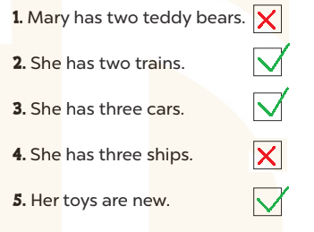 1. Mary has two teddy bear. (Mary có 2 con gấu bông.)
