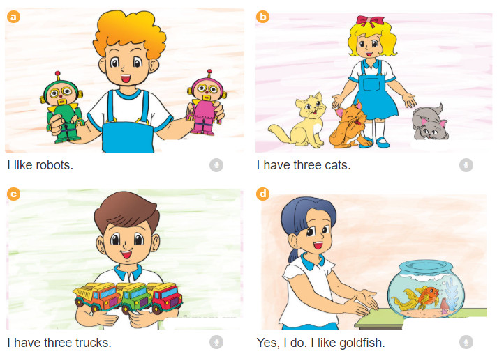 d. Bạn có thích thú nuôi/ cá vàng không? – Có. Tớ thích cá vàng.