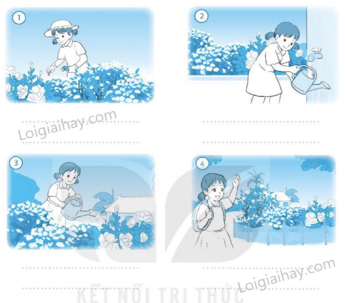 Tranh 4: Bạn nhỏ đang tưới nước cho những khóm hoa xinh xắn.