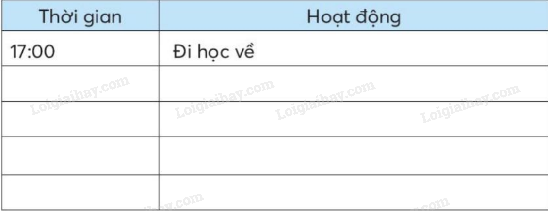 Viết thời gian biểu của em từ 5 giờ chiều (17:00) đến lúc đi ngủ.