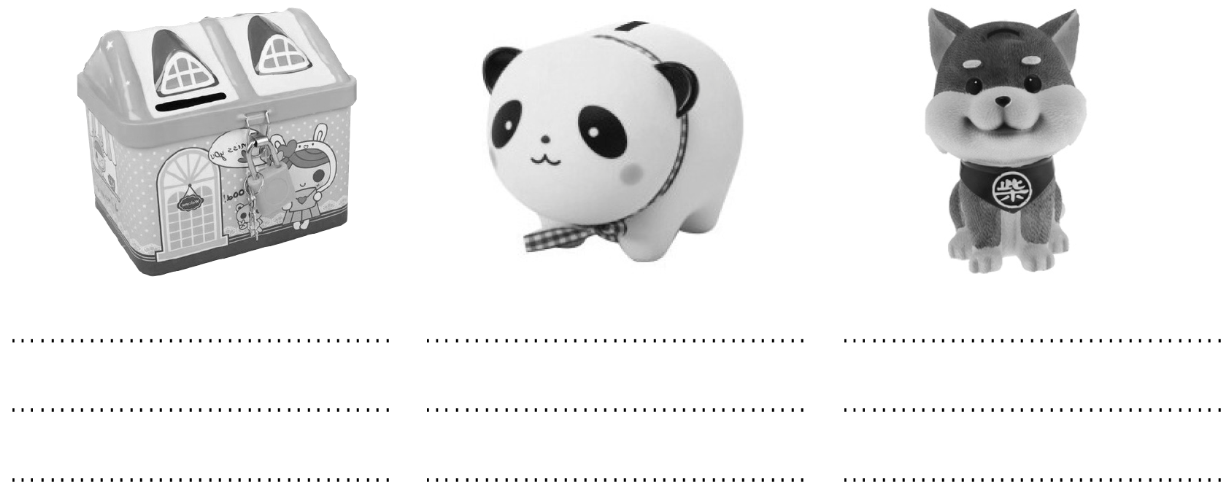 Viết vào dưới hình mỗi đồ vật những từ ngữ phù hợp chỉ các bộ phận của chúng: mắt, mũi, miệng, lưng, bụng, khe bỏ tiền, hình búp bê, tai, chân, cánh cửa, khoang đựng tiền, ổ khóa.