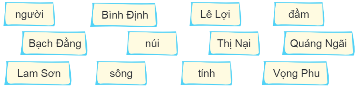 a. Tên gọi của một sự vật cụ thể: Bình Định, Lê Lợi, Bạch Đằng, Thị Nại, Quảng Ngãi, Lam Sơn, Vọng Phu.