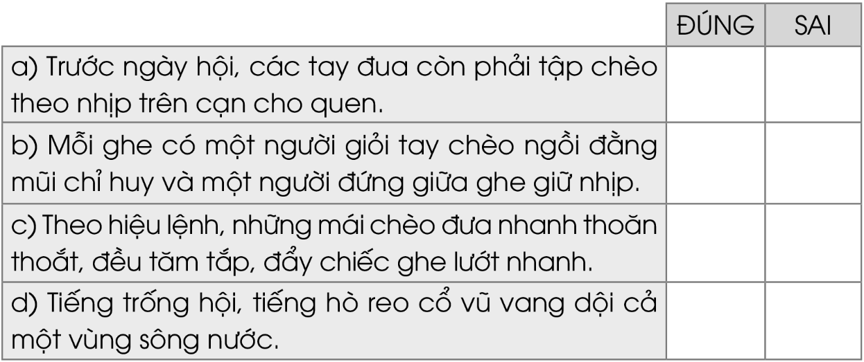 Ý nào dưới đây cho thấy cuộc đua ghe ngo diễn ra rất sôi động? Đánh dấu √ vào ô thích hợp: